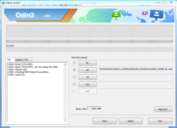 Abrimos Odin y en el campo AP o PDA seleccionamos el firmware que se ha descargado. Una vez seleccionamos el archivo .tar.md5, Odin tardara alrededor de 30 segundos en leerlo correctamente.