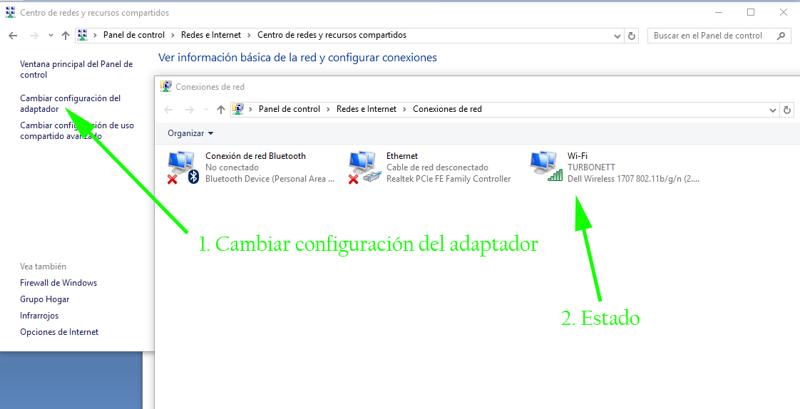 La segunda forma para encontrar la configuración IP en nuestra maquina es en el panel de control, redes e Internet, centro de redes y recursos compartidos: